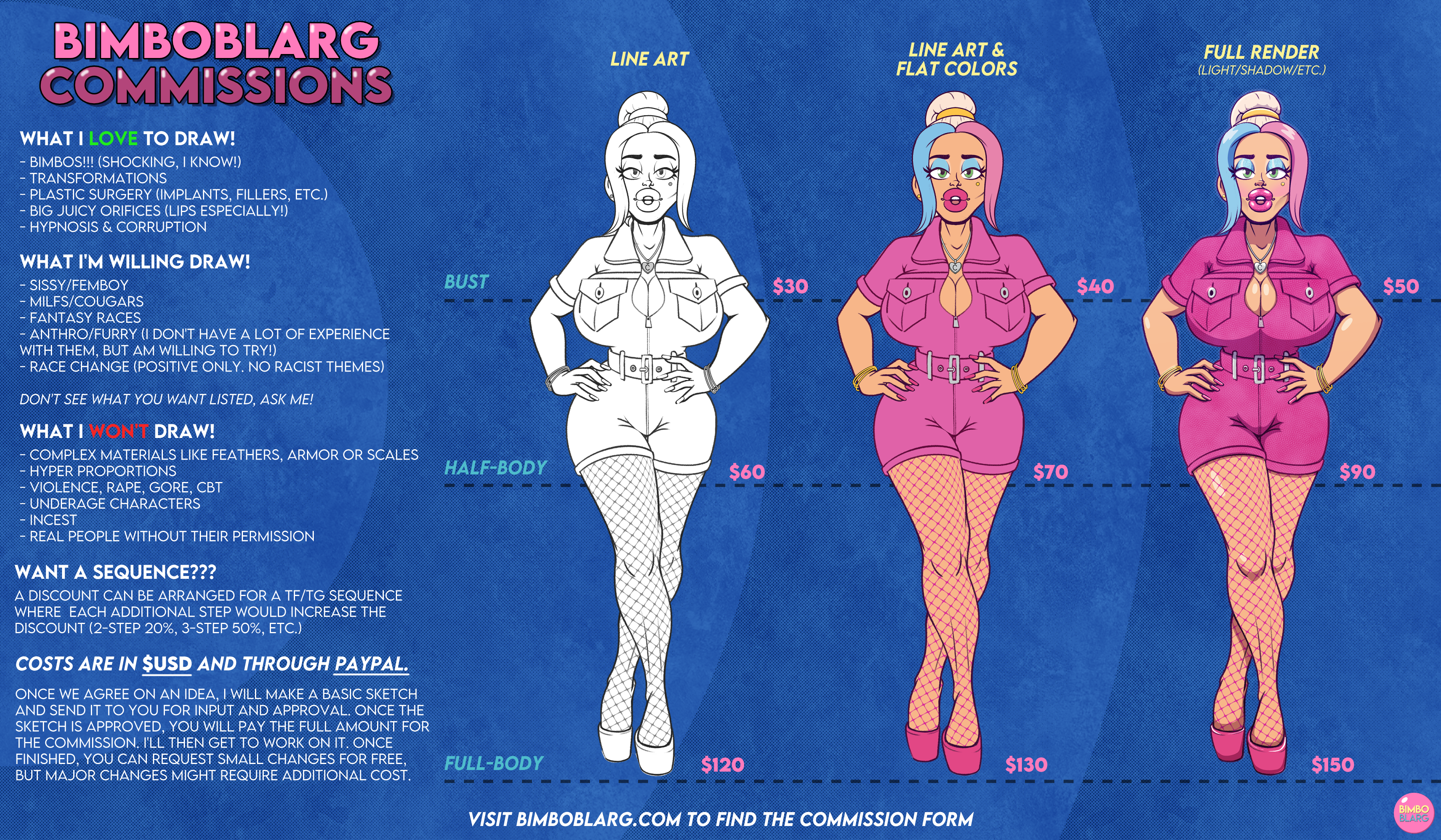 Hi and welcome to the official BimboBlarg website. Take off your coat and stay a while! I create stories, comics, and renders that surround fetishes like TG, TF, Bimbofication, and much more! If you’re into stuff like that, feel free to check out my work. If you’re curious about stuff like that, feel free to embrace your kinky side. If you’re just here to spread negativity, feel free to leave and never come back!